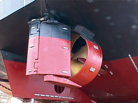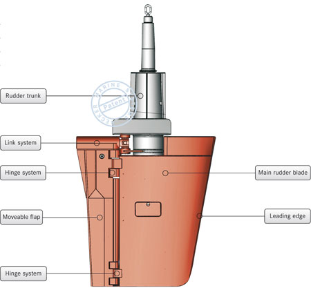 In order to avoid typical disadvantages of conventional rudders, Becker Marine Systems has developed the KSR (King Support Rudder) bearing arrangement concept. With this arrangement the trunk is extended into the rudder blade so that the lower neck bearing is positioned as close as possible to the vertical centre of pressure on the rudder. This results in reduced stresses and bending moments in the rudder blade as well as in the rudder stock.