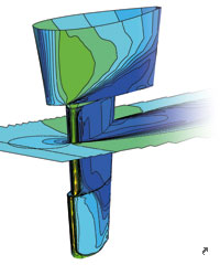 In order to avoid typical disadvantages of conventional rudders, Becker Marine Systems has developed the KSR (King Support Rudder) bearing arrangement concept. With this arrangement the trunk is extended into the rudder blade so that the lower neck bearing is positioned as close as possible to the vertical centre of pressure on the rudder. This results in reduced stresses and bending moments in the rudder blade as well as in the rudder stock.
