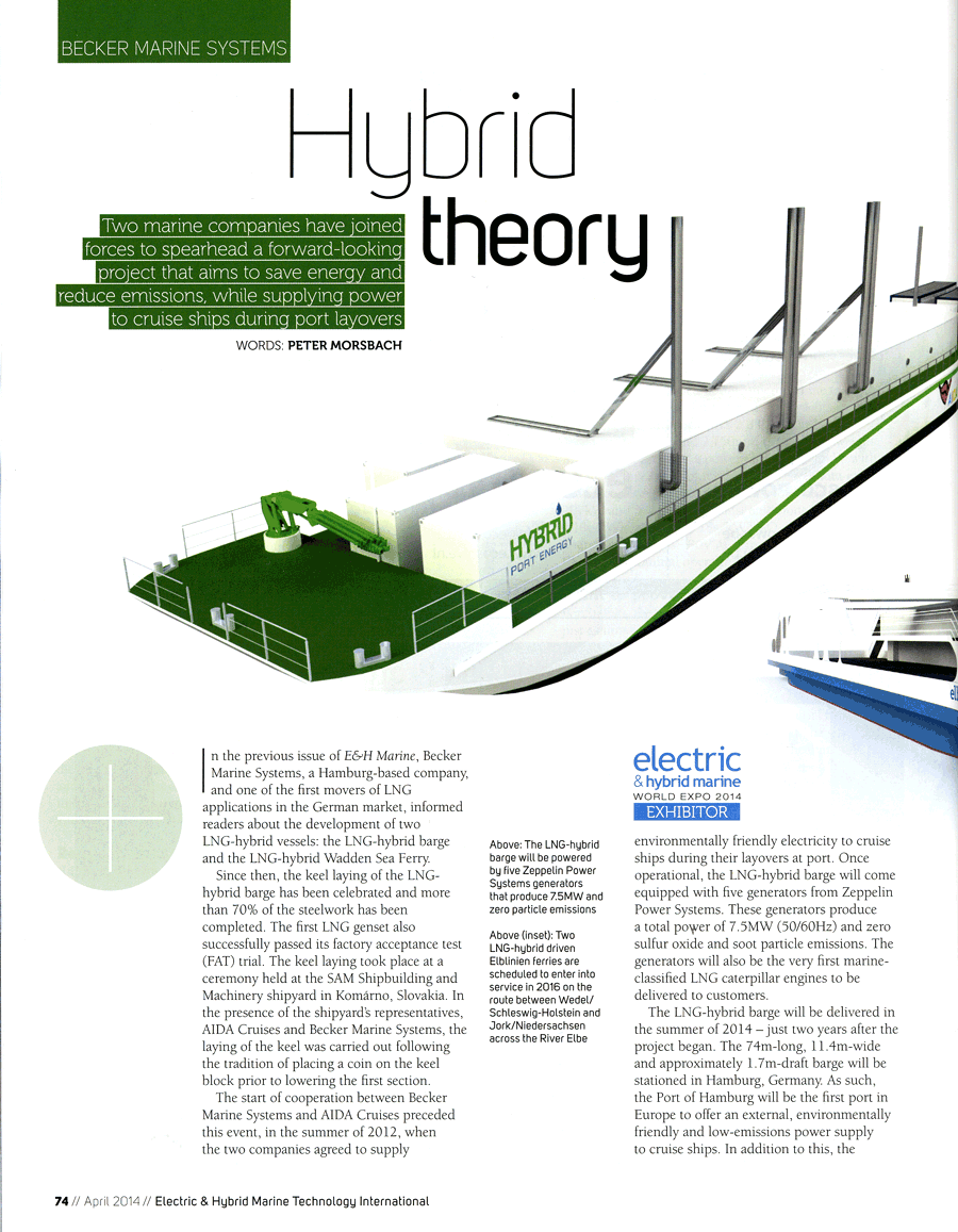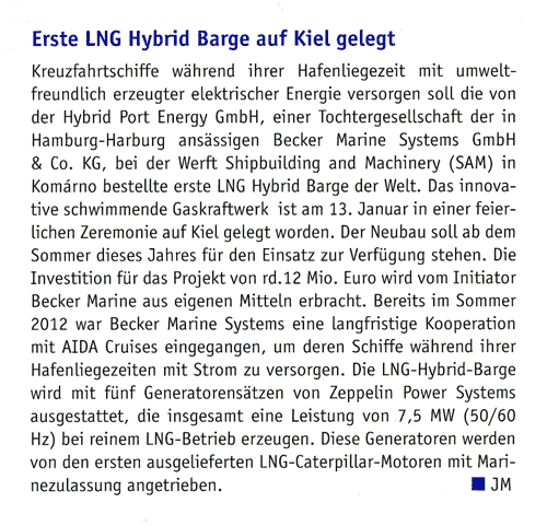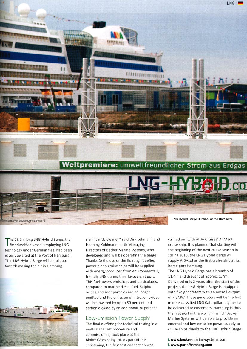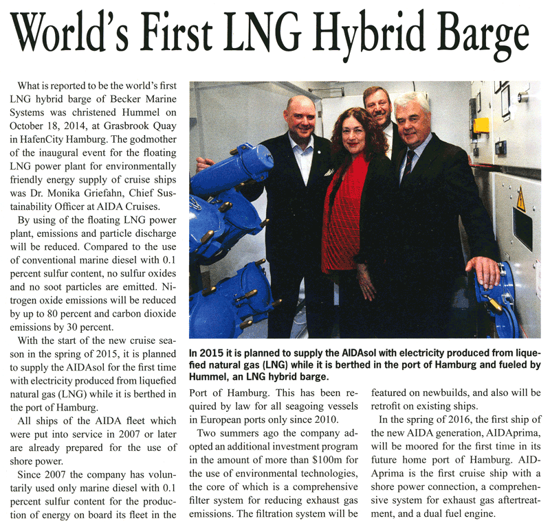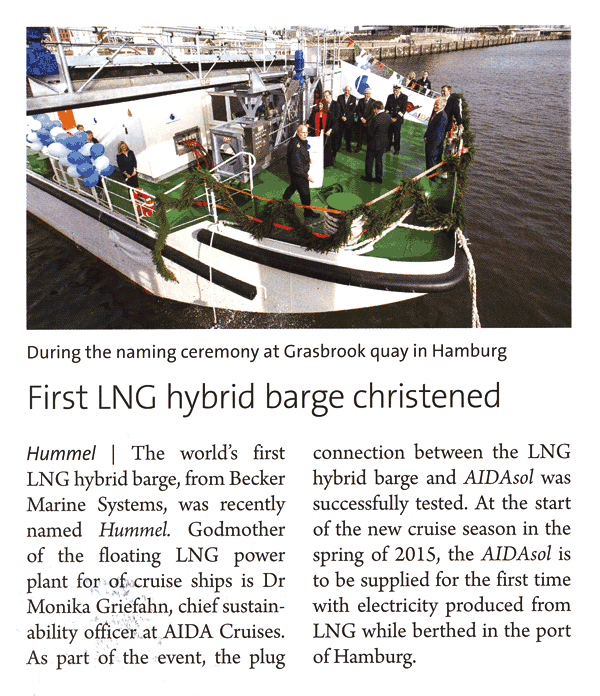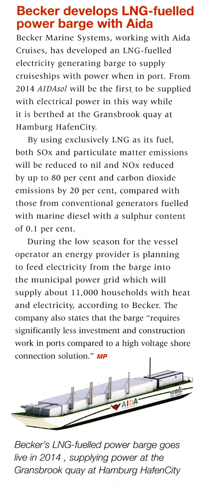Maritime Propulsion, December 2013/January 2014, "Becker develops LNG-fuelled power barge with AIDA"