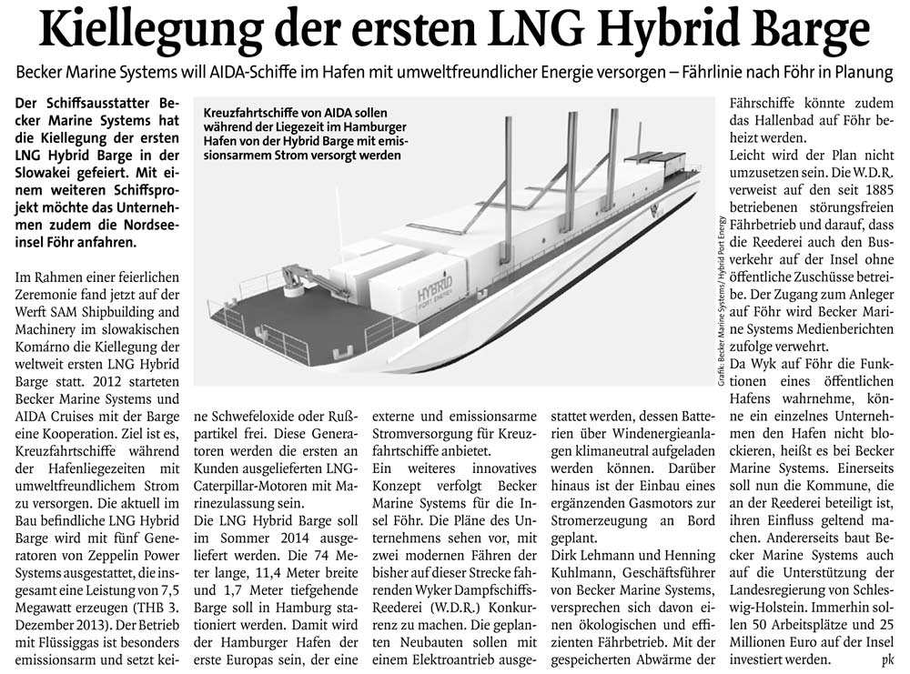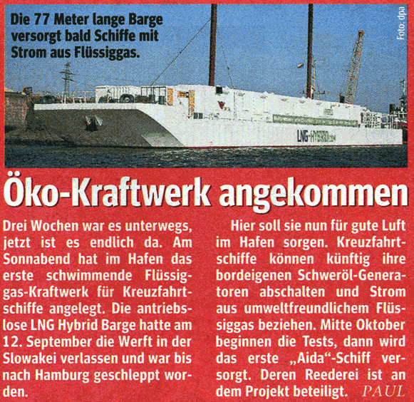 Lübecker Nachrichten, 13th September 2014, "Schwimmendes Kraftwerk für den Hafen"