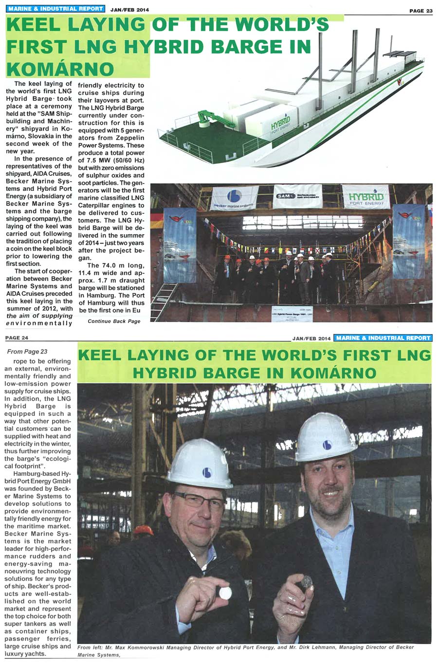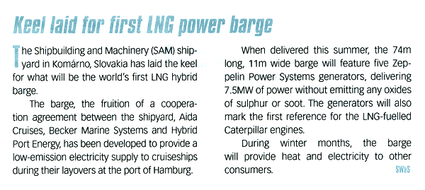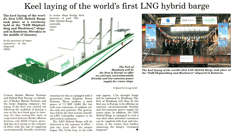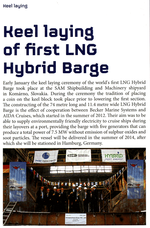 Marine & industrial Report, January/February 2014, "Keel laying of the world´s first LNG Hybrid barge in Komarno"