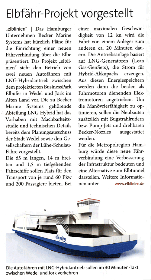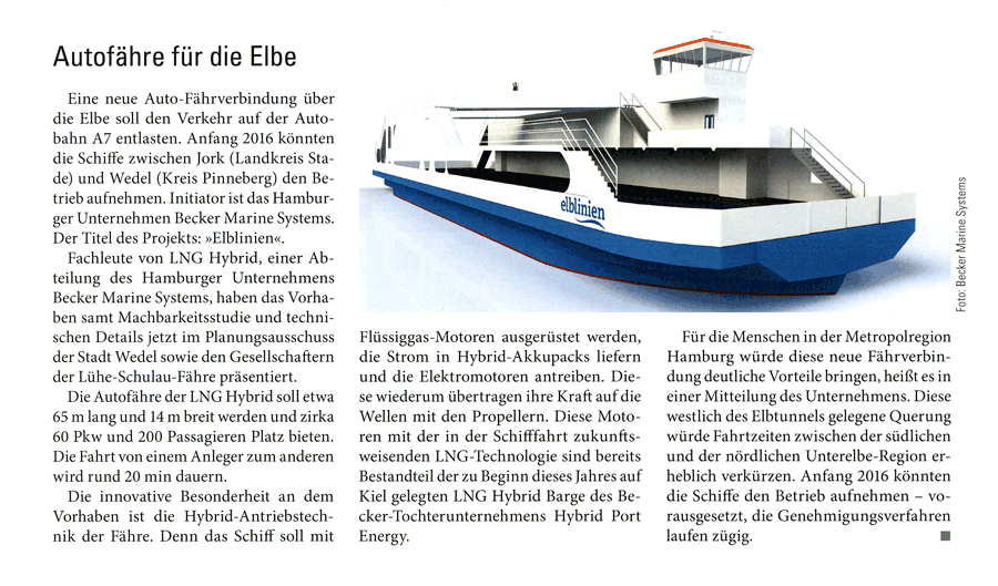 Schiffahrt Hafen Bahn und Technik, March 2014, "Autofähre zwischen Wedel und Jork geplant"