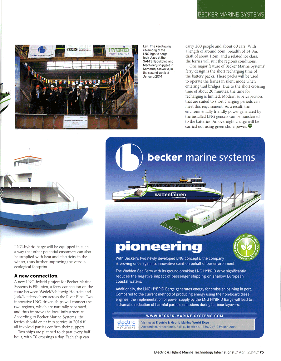 Work Boat World, March 2014, "Becker Marine announces keel laying of world´s first LNG Hybrid barge"