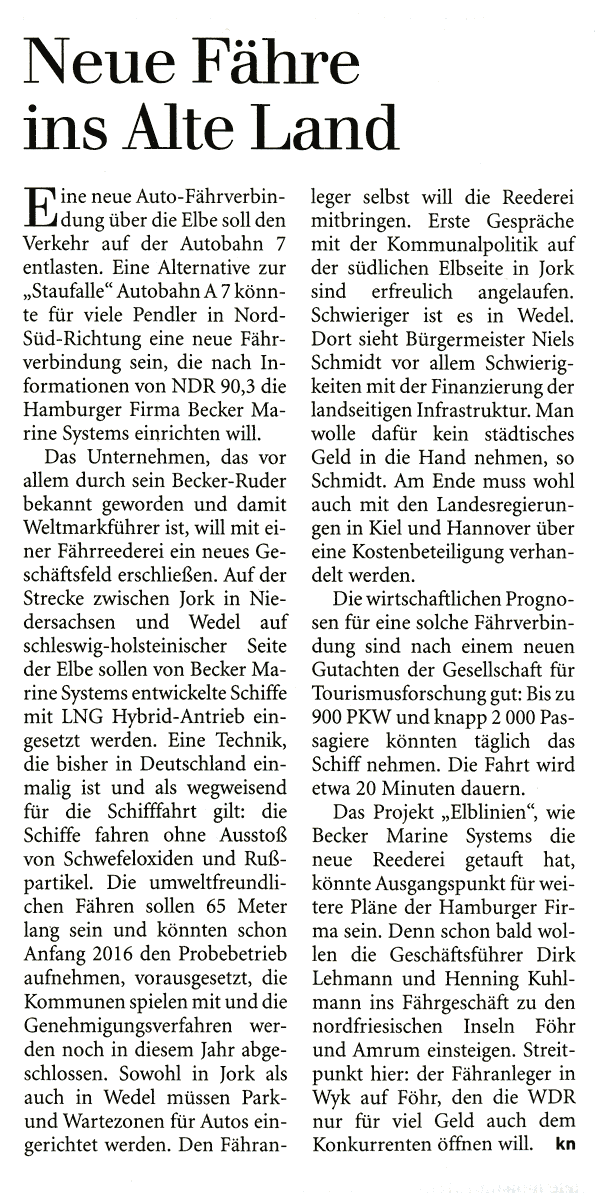 Hamburger Abendblatt, January 25th, 2014, "Hamburger planen Öko-Fähren nach Föhr"