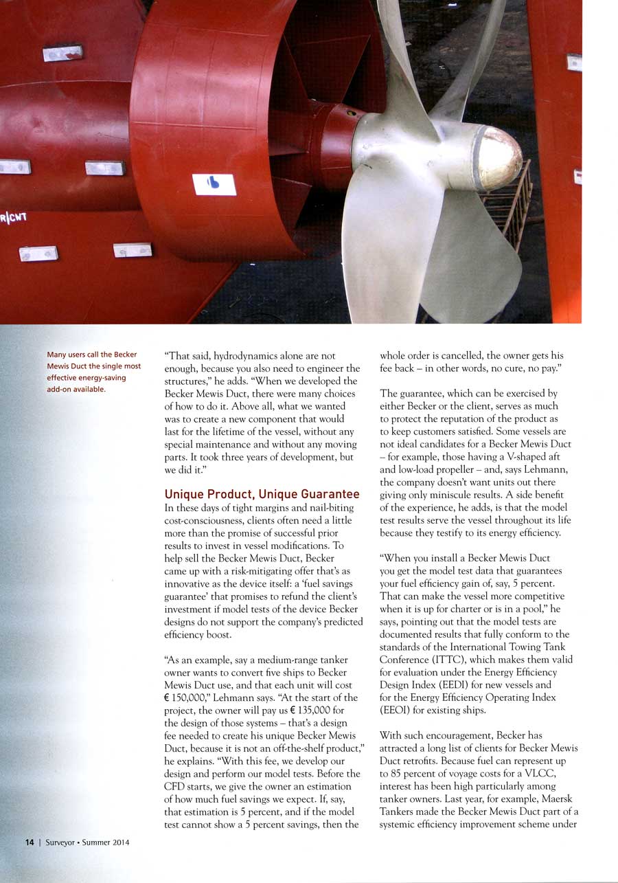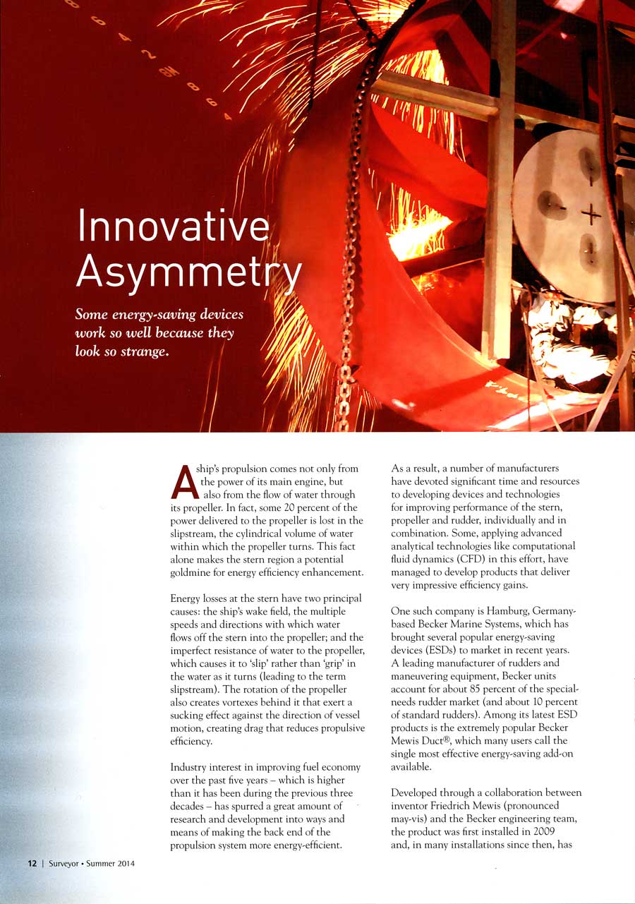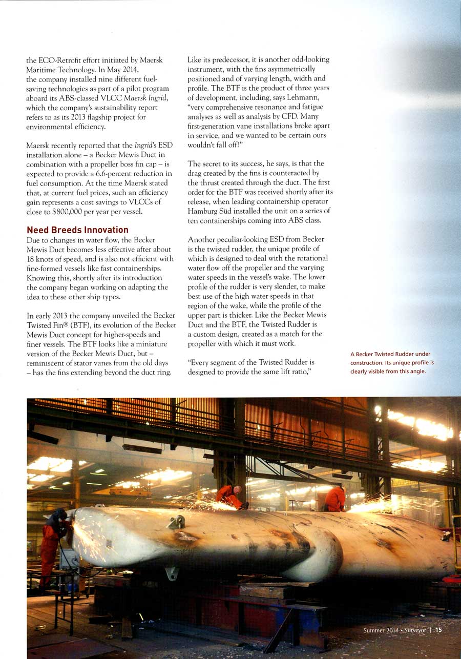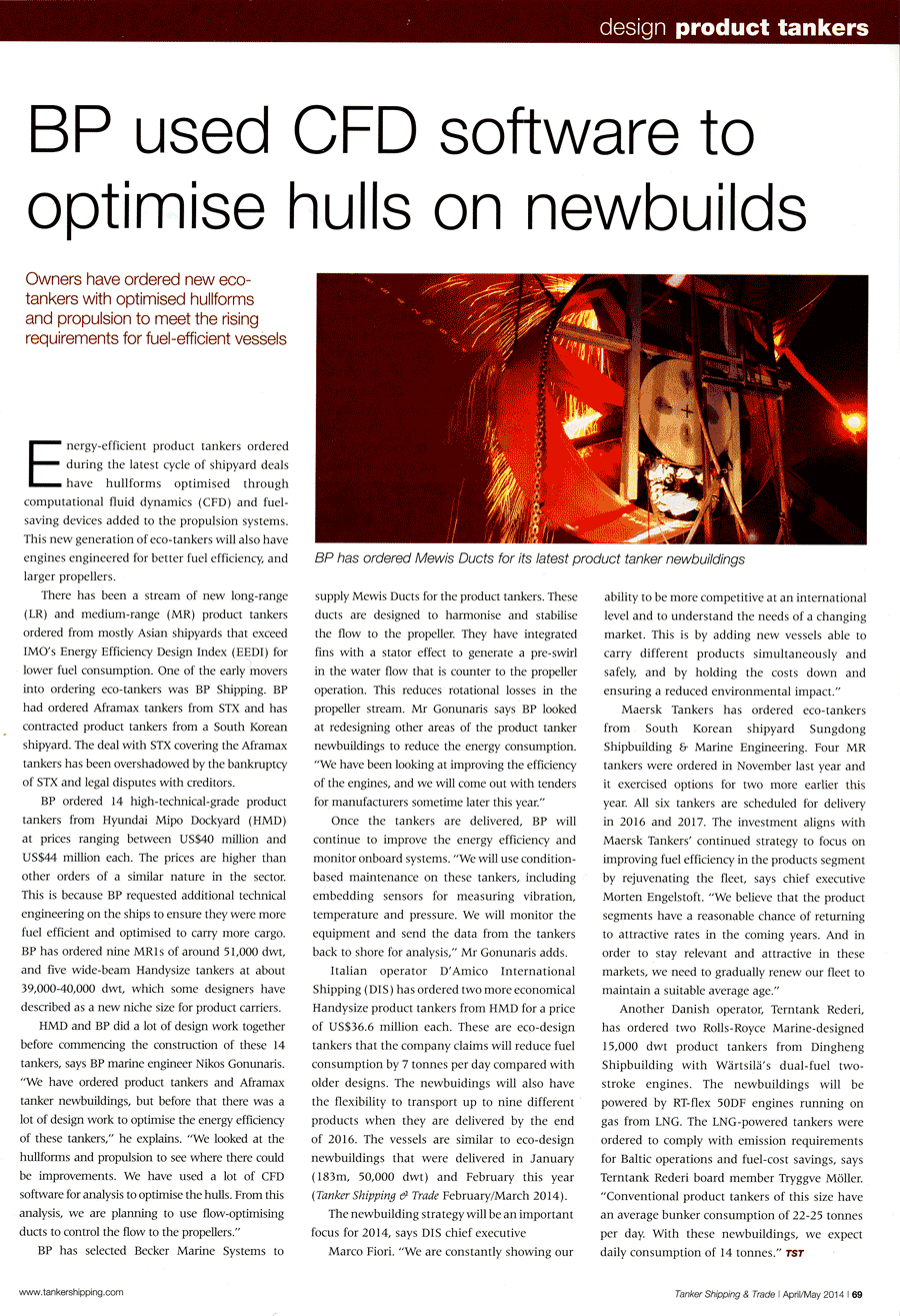 Tanker Shipping & Trade, April 2014, "BP used CFD software to optimise hulls..." (Becker Mewis Duct®)