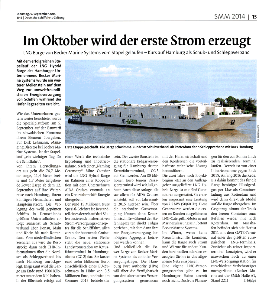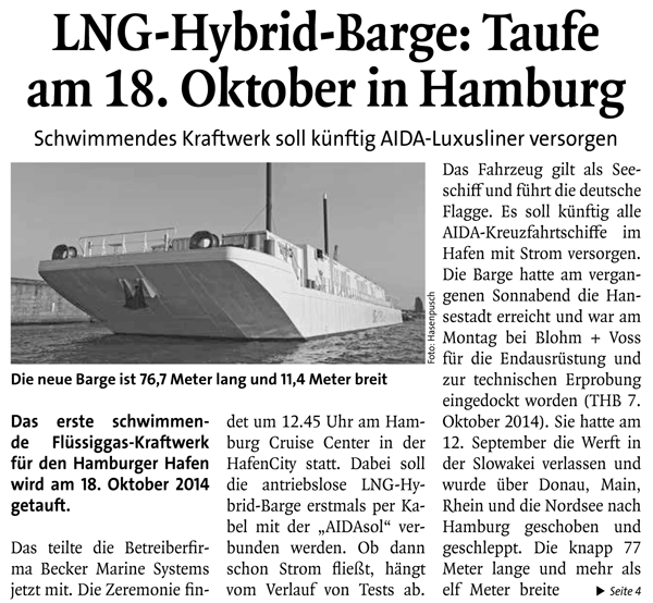 Täglicher Hafenbericht, 9th October 2014, "LNG-Hybrid-Barge: Taufe am 18. Oktober in Hamburg"