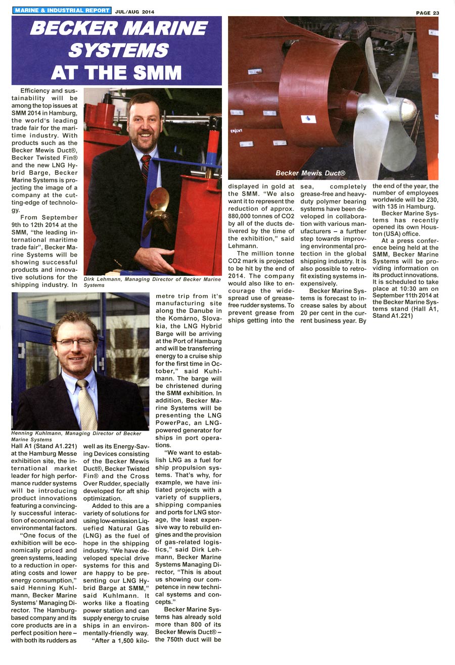 Marine & industrial Report, September/October 2014, "Becker Marine Systems at the SMM"