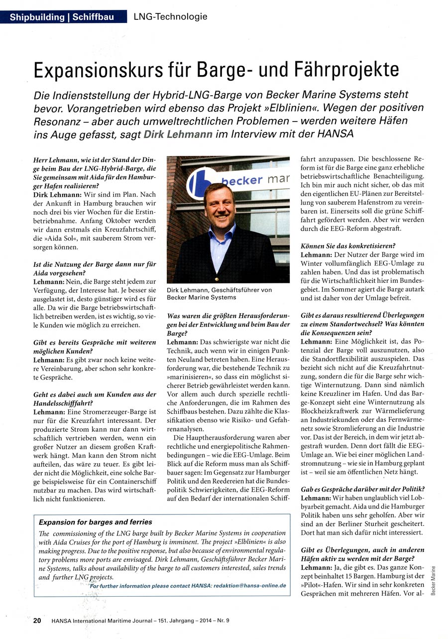 Hansa, September 2014, "Expansionskurs für Barge- und Fährprojekte"