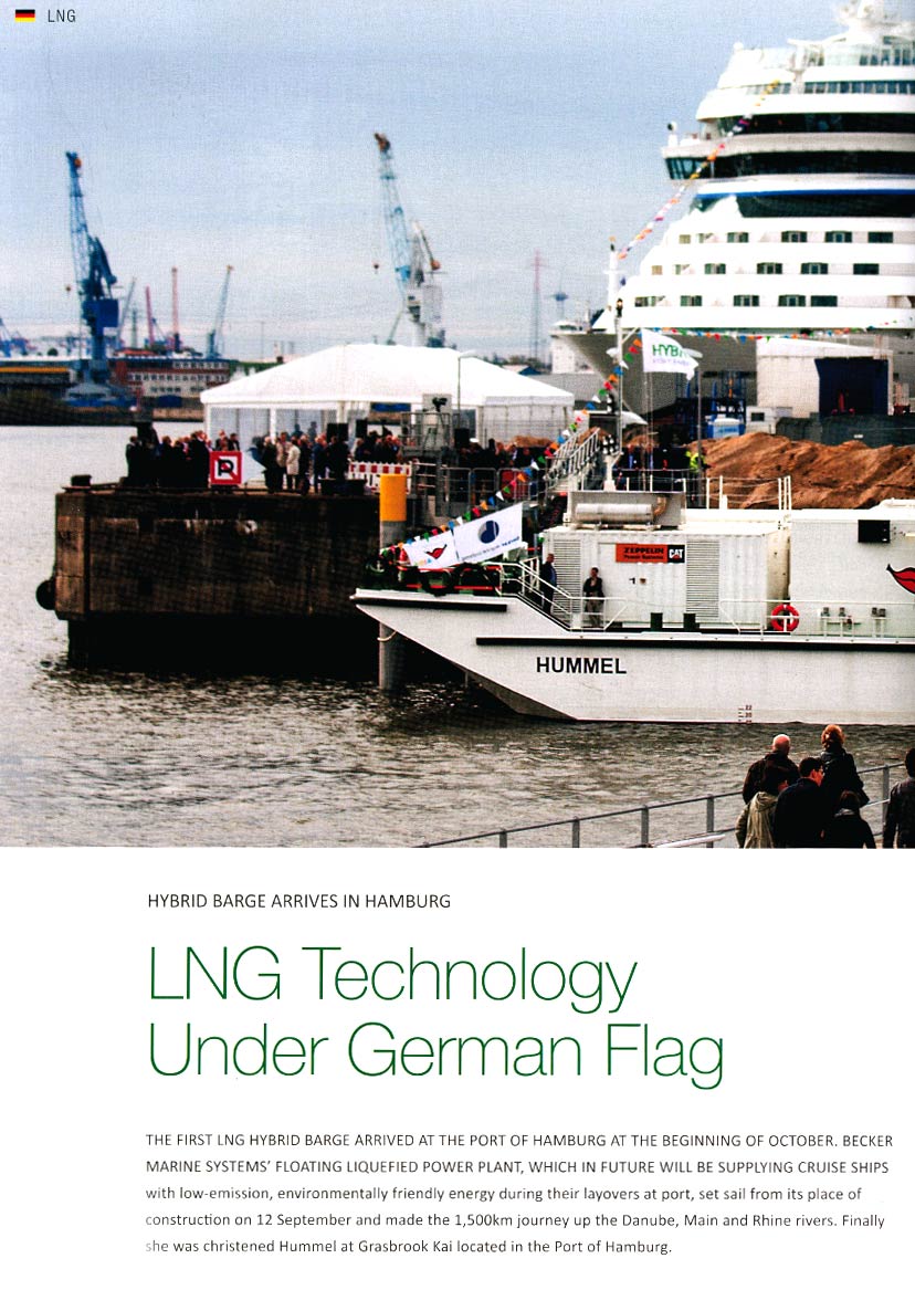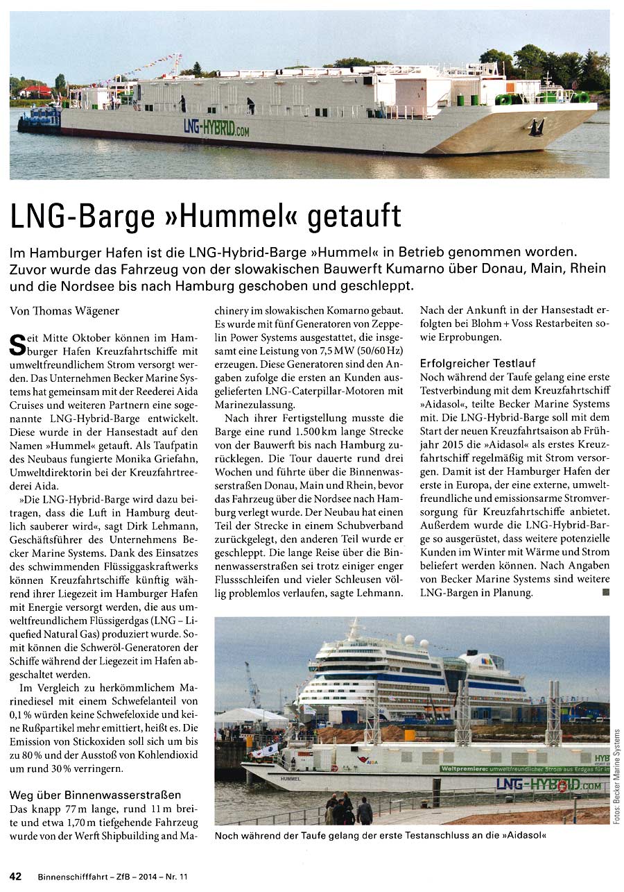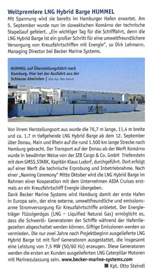 Schiffahrt Hafen Bahn und Technik, October 2014, "Weltpremiere LNG Hybrid Barge HUMMEL"