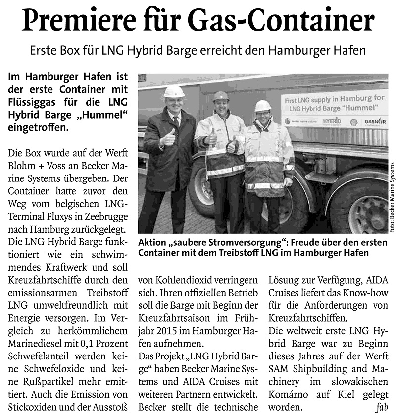 Täglicher Hafenbericht, 11th December 2014, "Premiere für Gas-Container" (LNG Hybrid Barge)