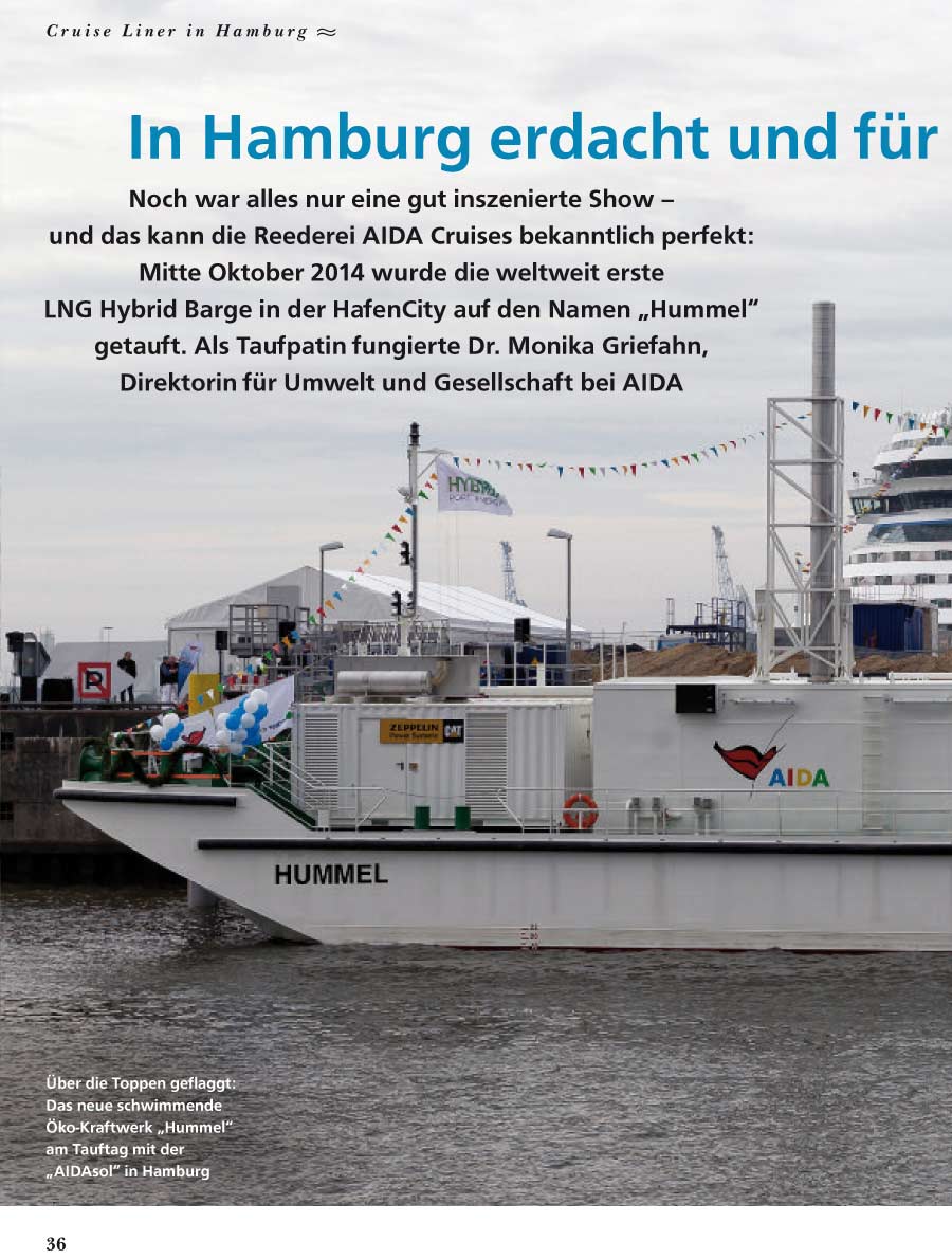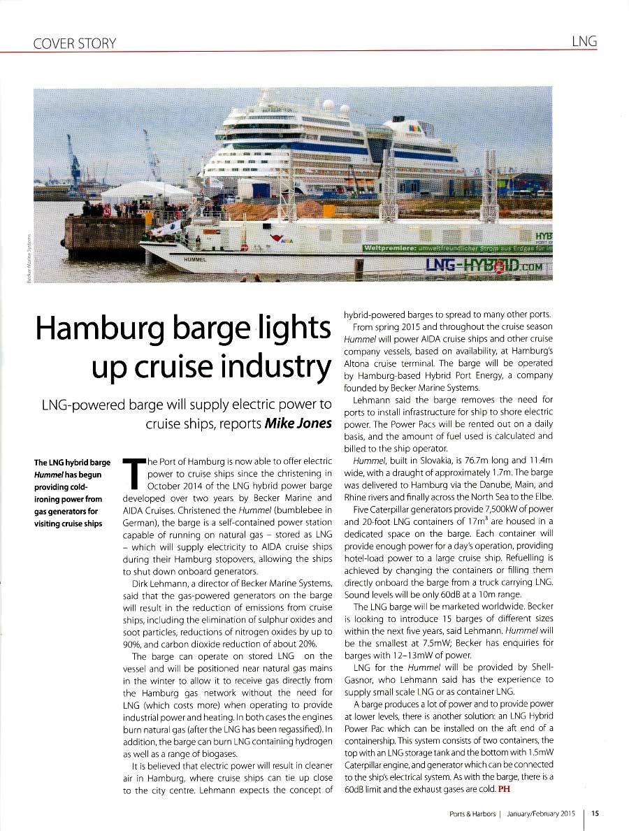 Ports & Harbors, January/February 2015, "Hamburg barge lights up cruise industry"