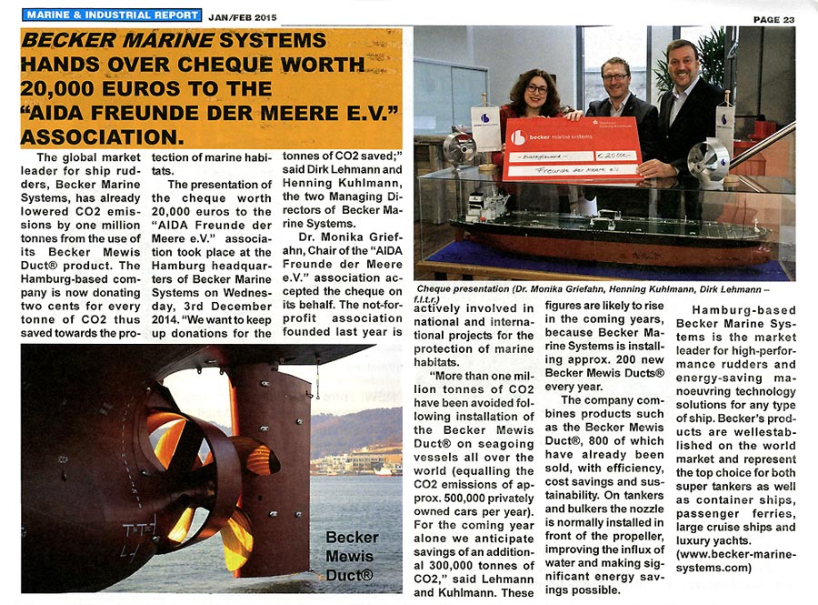 Marine & industrial Report, January/February 2015, "Becker Marine Systems hands over cheque (...)"