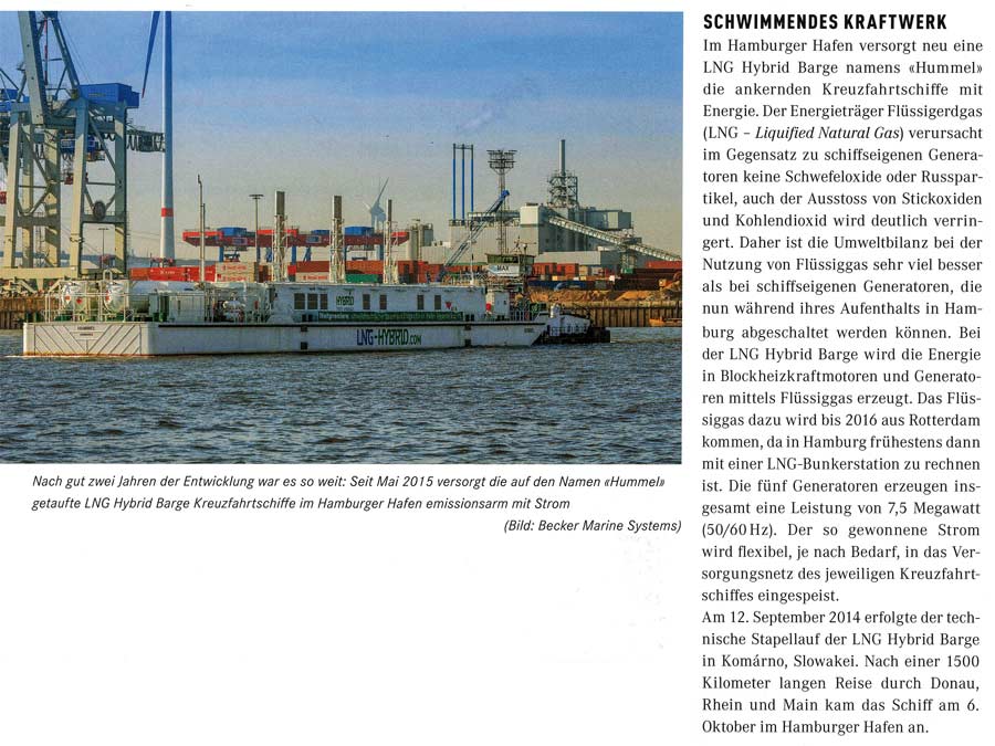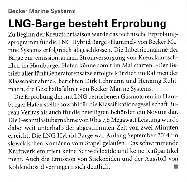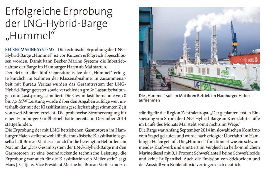 Schiff & Hafen, April 2015, "Erfolgreiche Erprobung der LNG-Hybrid-Barge "Hummel""