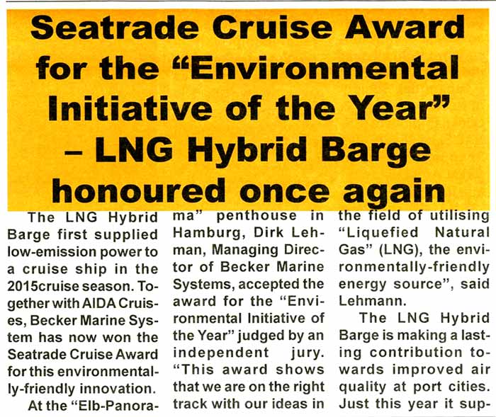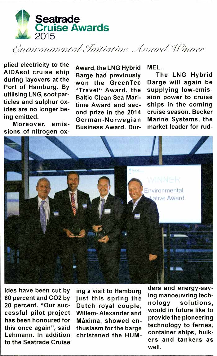 Marine & industrial Report, September/October 2015, "Seatrade Cruise Award for (...) LNG Hybrid Barge"