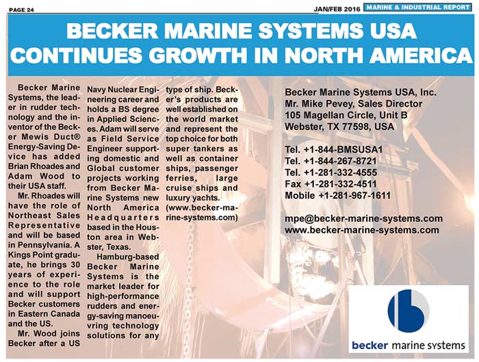 Marine & industrial Report, January/February 2016, "Becker USA continues growth in North America"