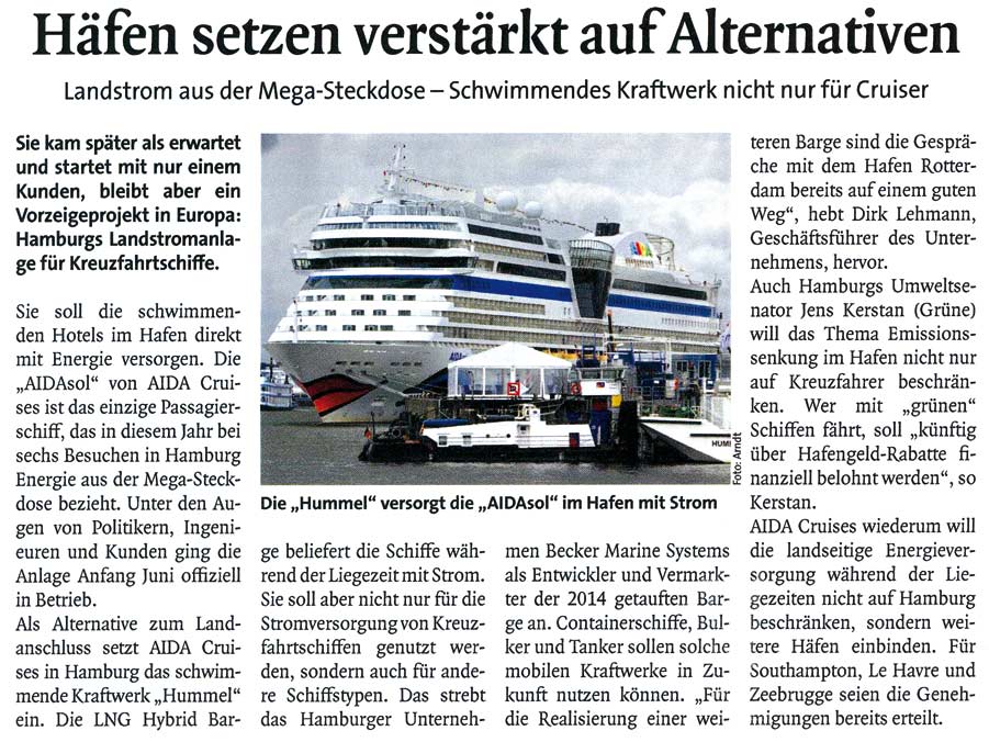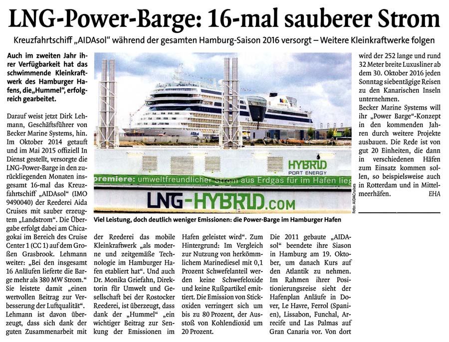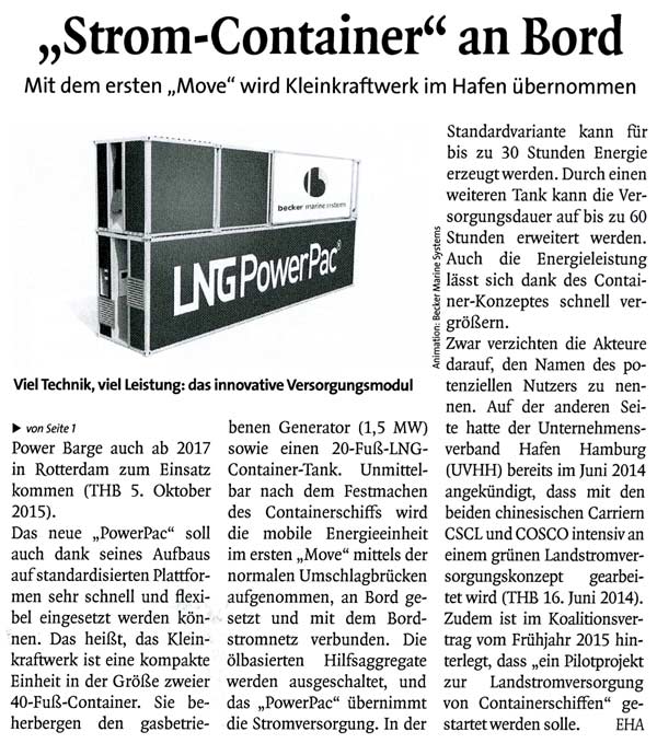 Täglicher Hafenbericht THB, 17th February 2016, "Grüner Strom für Box-Carrier im Hafen" (LNG PowerPac®)
