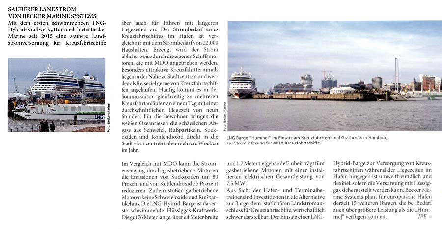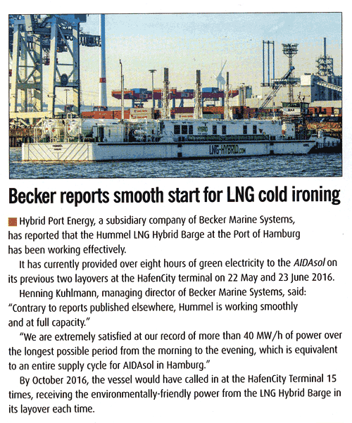 The MotorShip, September 2016, "Becker reports smooth start for LNG cold ironing"