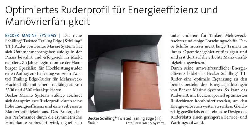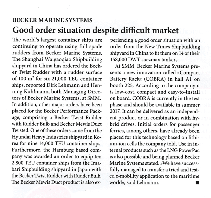 Deutsche Seeschifffahrt, September 2016, "Becker Marine: Doppelt hält besser" (SMM preview)