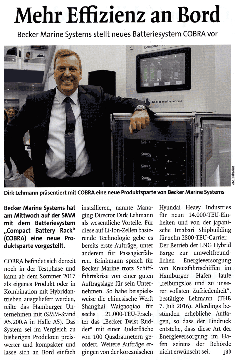 Täglicher Hafenbericht THB, 8th September 2016, "Mehr Effizienz an Bord" (Becker COBRA)